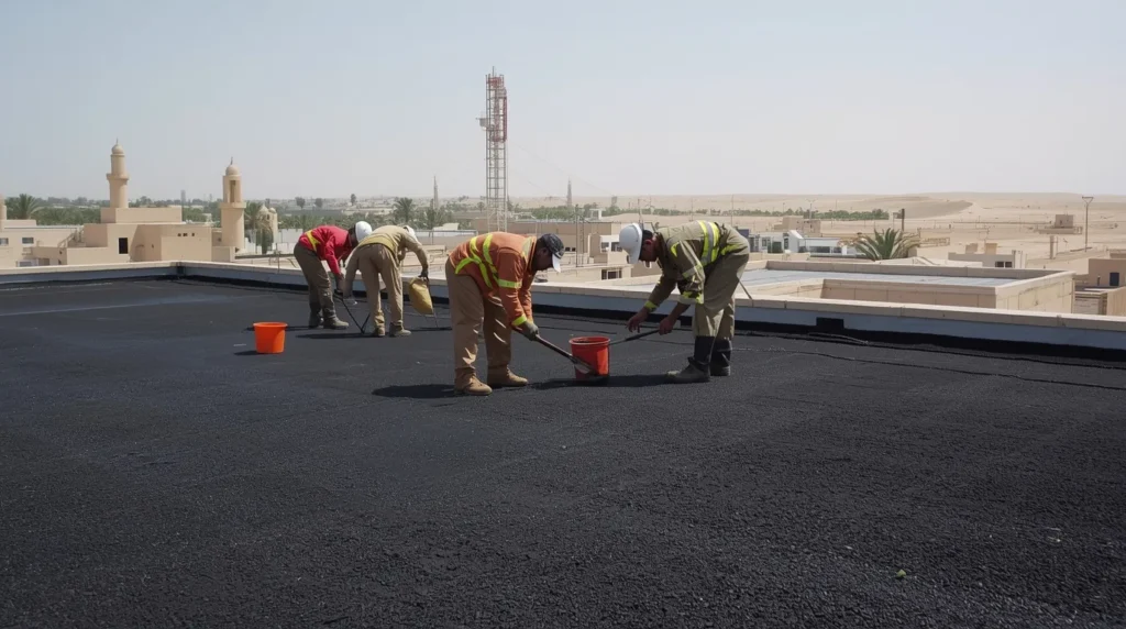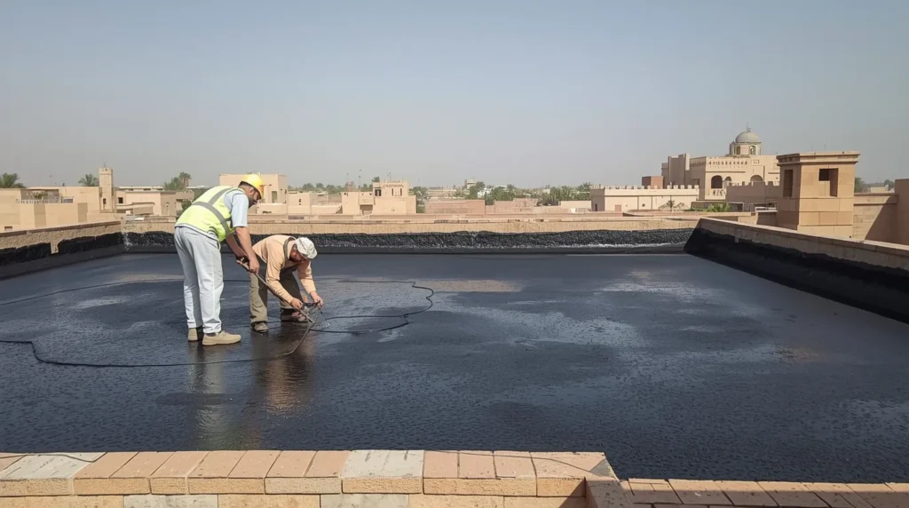 - النهائية والاختبار: نطبق طبقة الحماية النهائية إذا لزم الأمر (مثل طبقة الحبيبات للبيتومين). وأخيراً، نقوم باختبار العزل عن طريق رش الماء لمحاكاة المطر الغزير للتأكد من عدم وجود أي تسرب.”